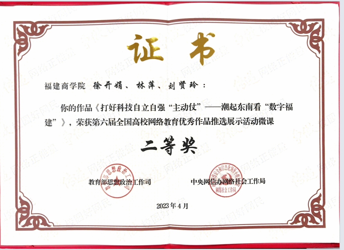 世俱杯徐开娟老师的作品《打好科技自立自强“主动仗”-----潮起东南看“数字福建”》,荣获第六届全国高校网络教育优秀作品推选展示活动微课二等奖。