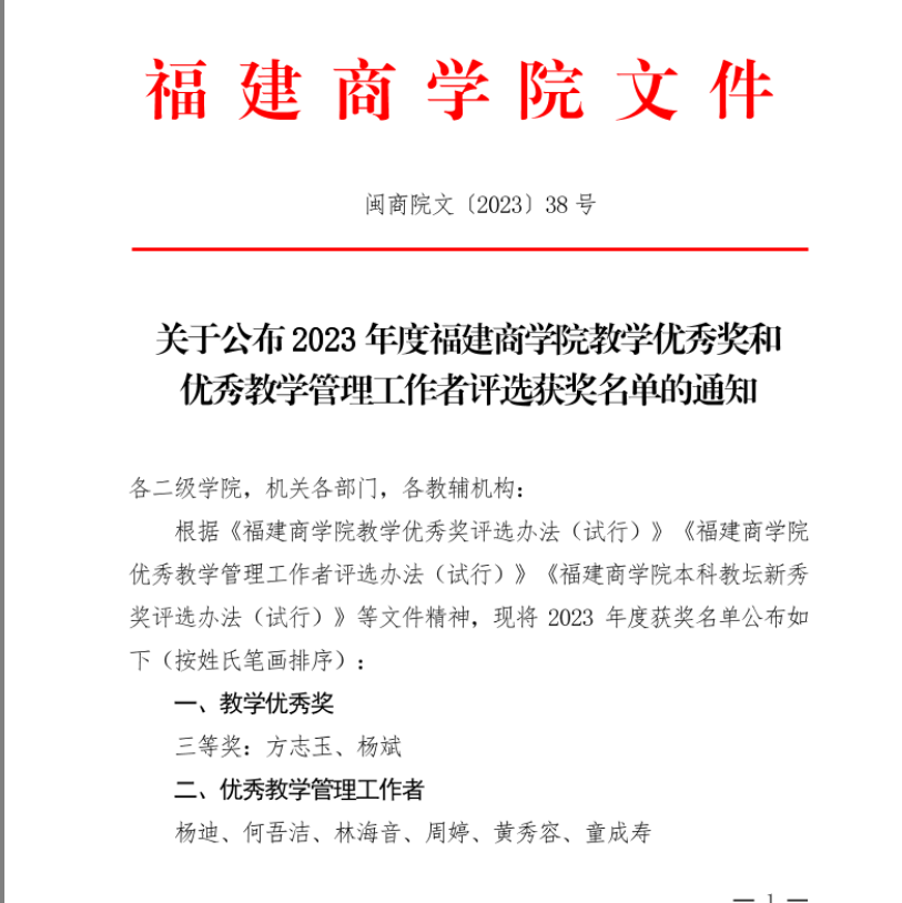 喜讯:世俱杯周婷老师获得2023年度福建商学院优秀教学管理工作者荣誉称号