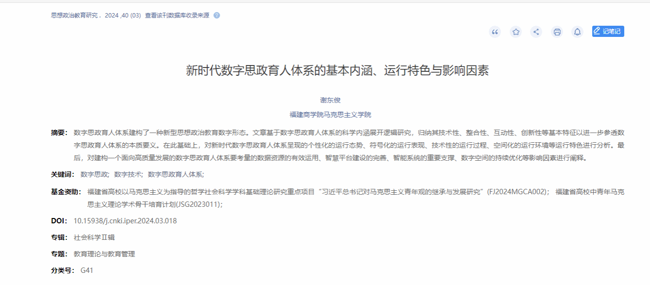 近日,世俱杯谢东俊副院长在北大核心期刊《思想政治教育研究》发表文章《新时代数字思政育人体系的基本内涵、运行特色与影响因素》