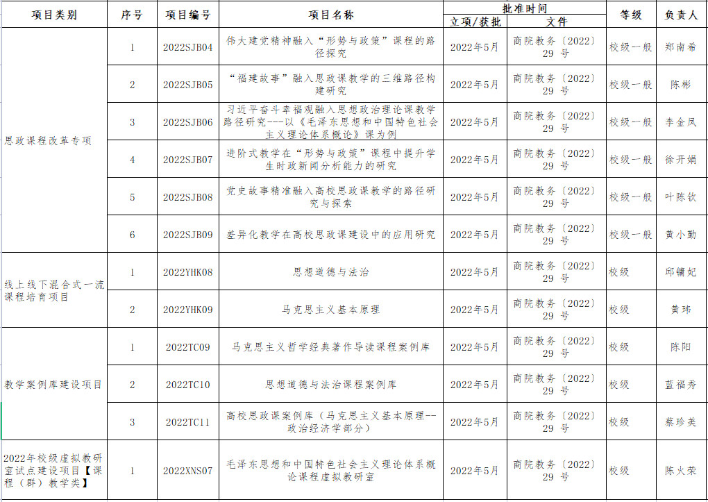 近期,关于公布2022年本科教育教学改革研究项目等立项名单的通知(商院教务〔2022〕29 号),世俱杯思政课程改革专项立项6项,线上线下混合式一流课程培育项目立项2项,教学案例库建设项目立项3项,虚拟教研室试点建设项目【课程(群)教学类】立项1项。