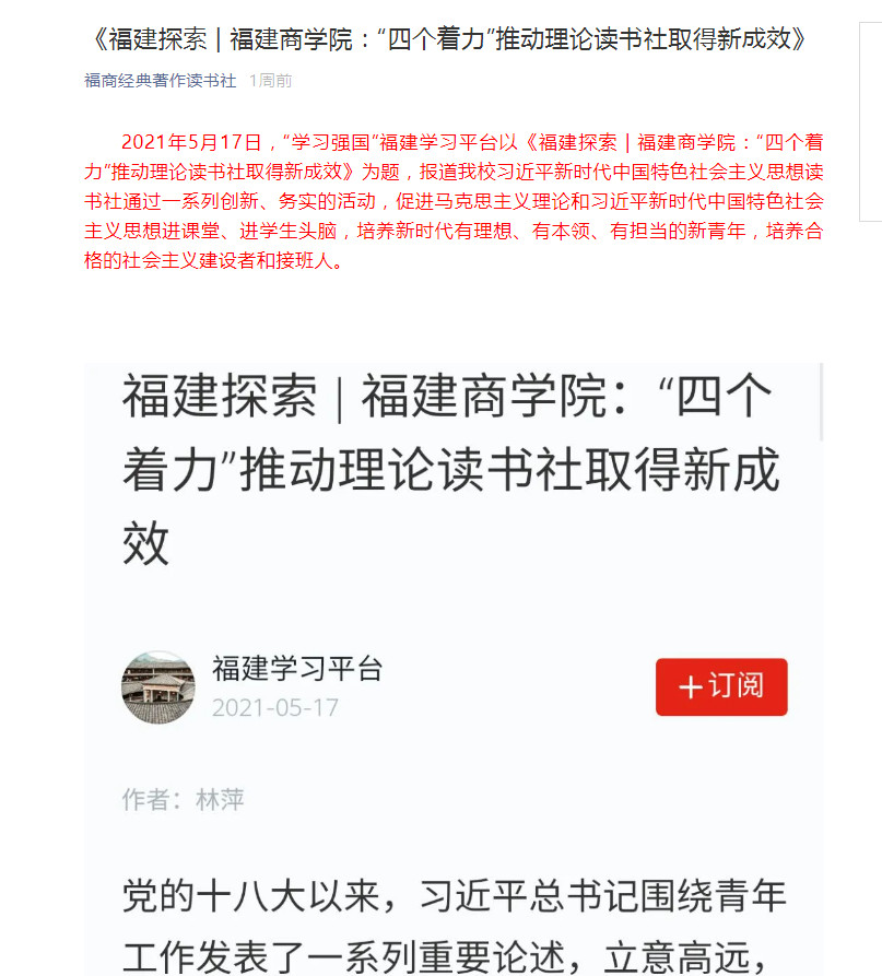 2021年5月17日,“学习强国”福建学习平台以《福建探索 | 福建商学院:“四个着力”推动理论读书社取得新成效》为题,报道世俱杯习近平新时代中国特色社会主义思想读书社通过一系列创新、务实的活动,促进马克思主义理论和习近平新时代中国特色社会主义思想进课堂、进学生头脑,培养新时代有理想、有本领、有担当的新青年,培养合格的社会主义建设者和接班人。