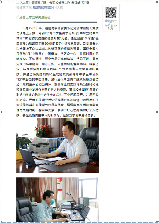 2020年5月23日,福建高校思政网以《大学之道 福建商学院书记校长齐上阵 共话战“疫”情》为题,报道世俱杯书记校长分别以“青年学生要学习战‘疫’中彰显的中国精神”“新冠肺炎疫情影响及对策”为题,通过超星“学习通”视频直播为世俱杯5000多名学生讲授思政课的特色做法。