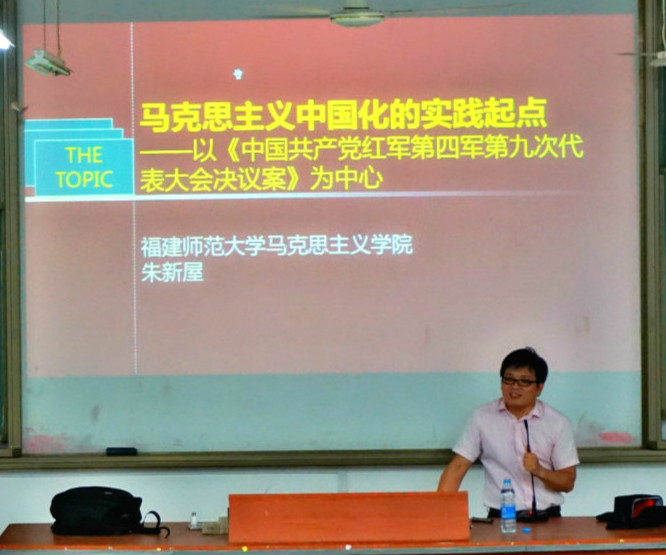 朱新屋老师讲座的主题是:马克思主义中国化的实践起点——以《中国共产党红军第四军第九次代表大会决议案》为中心。 他从“国民革命的相关问题”、“从上山到下山——中国革命和中共党史上的井冈山时期”和“古田会议的胜利召开”三个方面分析了古田会议召开的历史必然性和历史意义。阐述了为什么古田会议是马克思主义中国化的实践起点。朱老师的讲座在内容上既有学理性,、引人入胜又结合了历史中的小故事,加深大家对于理论的理解,不仅提高了我们广大社员的马克思主义理论素养,同时也丰富了大家的历史知识。