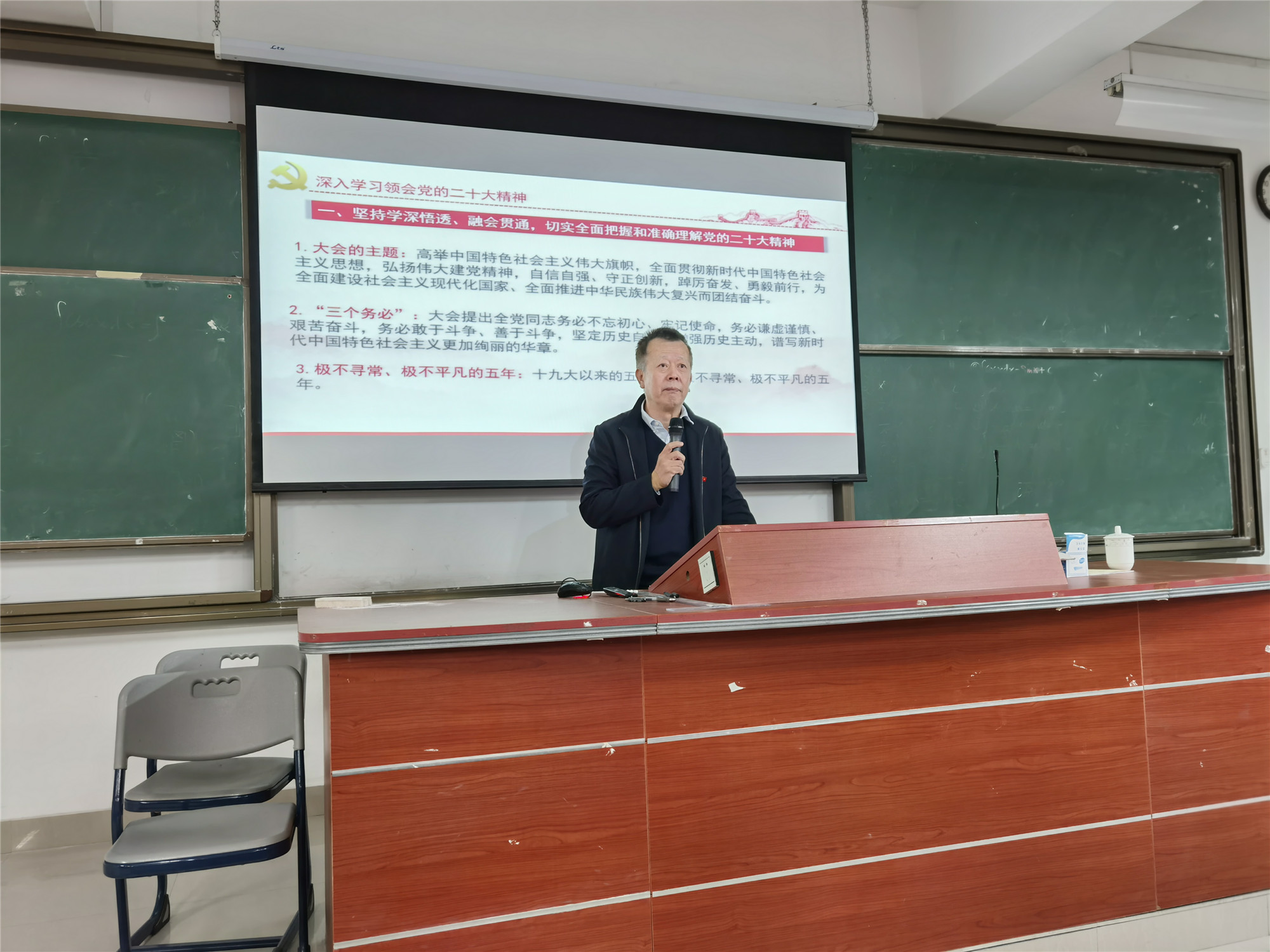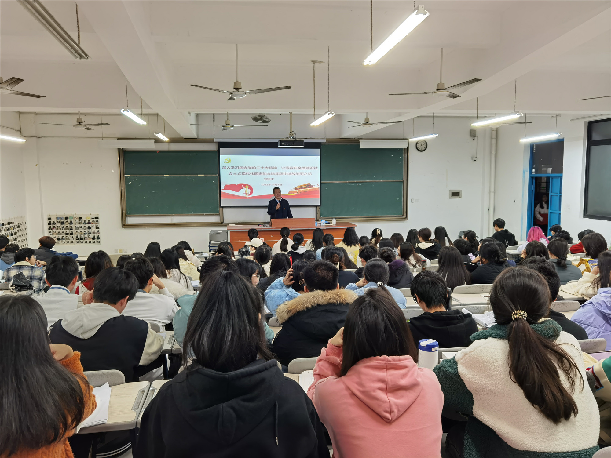 刘书记从党的二十大的主题和重大意义、过去五年的工作和新时代十年的伟大变革、习近平新时代中国特色社会主义思想的世界观和方法论、新时代新征程中国共产党的使命任务等15个方面,全面系统解读了党的二十大精神。并就如何学习宣传贯彻党的二十大精神提出了原原本本学、逐字逐句学、联系实际学三点要求。最后,他还就如何践行党的二十大精神与同学们互动交流,勉励大家紧紧围绕党的二十大确定的目标任务,坚定理想信念,做新时代有理想的好青年;勇于担当尽责,做新时代敢担当的好青年;踏实埋头苦干,做新时代能吃苦的好青年;矢志艰苦奋斗,做新时代肯奋斗的好青年,让青春在全面建设社会主义现代化国家的火热实践中绽放绚丽之花。