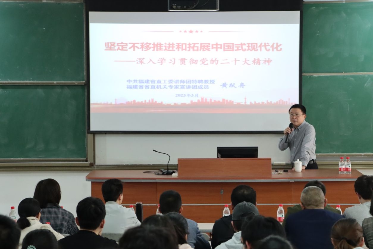 3月21日下午,中共福建省直工委讲师团特聘教授、省直机关专家宣讲团成员黄跃舟应邀到世俱杯开展“坚定不移推进和拓展中国式现代化——深入学习贯彻党的二十大精神”专题讲座。世俱杯sjb官网部分教师、连江校区“青马”班部分学员、校习近平新时代中国特色社会主义思想读书社部分社员参加学习。