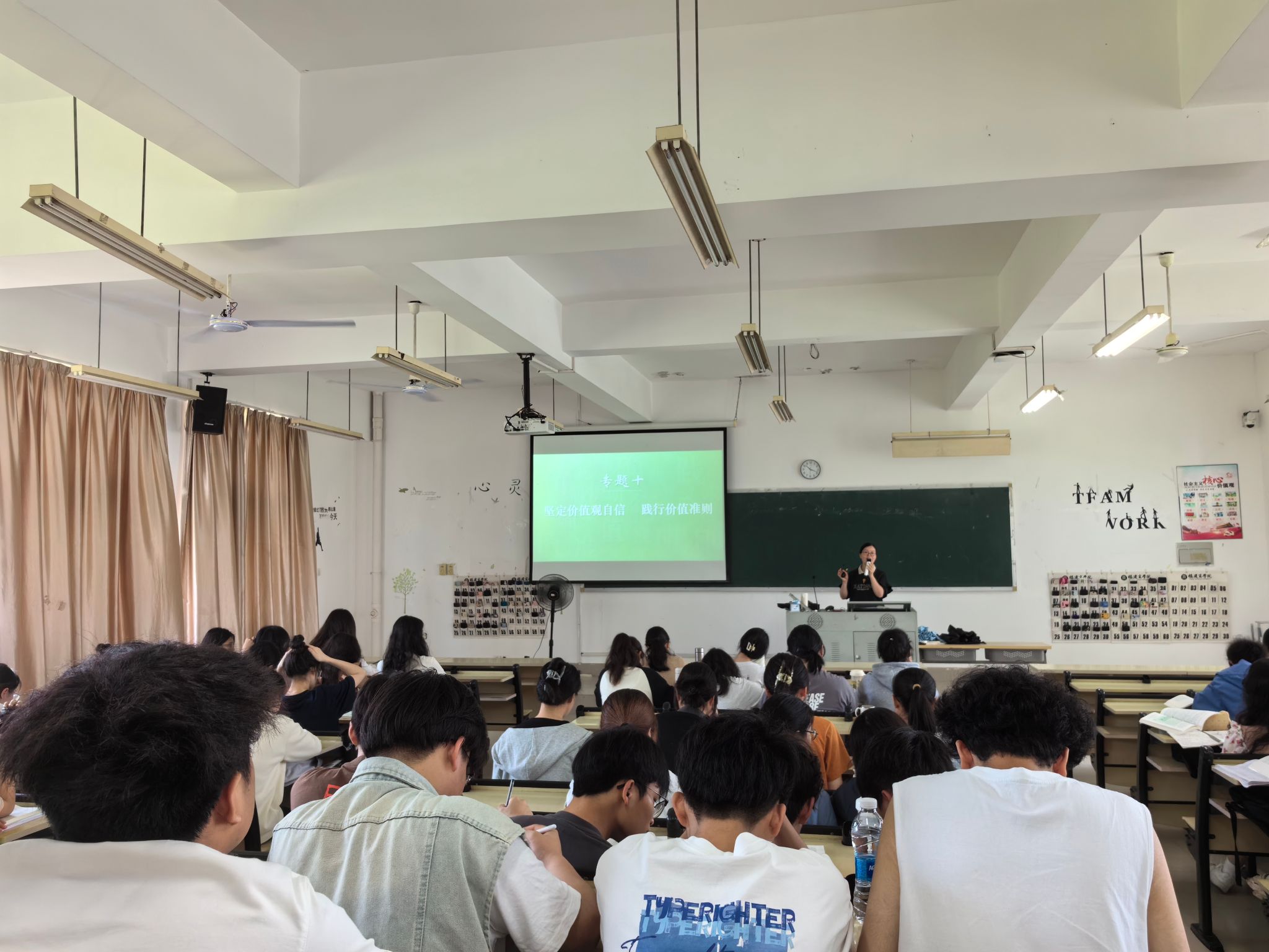 4月15日上午,世俱杯sjb官网思想道德与法治教研室蓝福秀老师以“坚定价值观自信 践行价值准则”为主题,在马尾校区至善楼楼T3教室开展本学期公开示范课教学,近110名师生参与观摩。