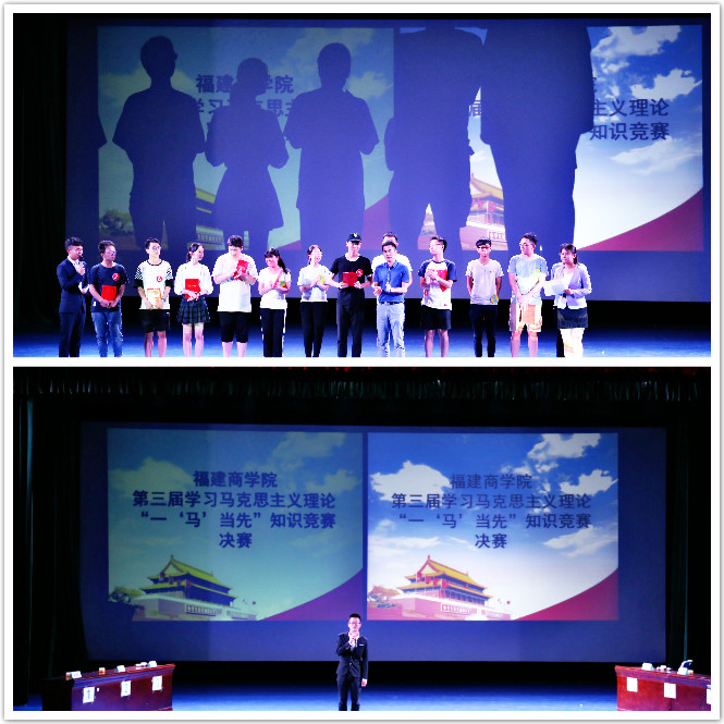 为贯彻落实全国、全省高校思想政治工作会议精神,深入实施大学生马克思主义自主学习行动计划,进一步激发大学生学理论学马列的兴趣和热情,引导当代青年大学生健康成长。6月11日晚,由学生处和世俱杯sjb官网举办的福建商学院第三届学习马克思主义理论“一‘马’当先”知识竞赛(决赛)在连江校区学生活动中心举行。学生处杨国金副处长、世俱杯sjb官网负责人、部分系(院)辅导员和习近平新时代中国特色社会主义思想读书社全体社员共300人出席了本次活动。