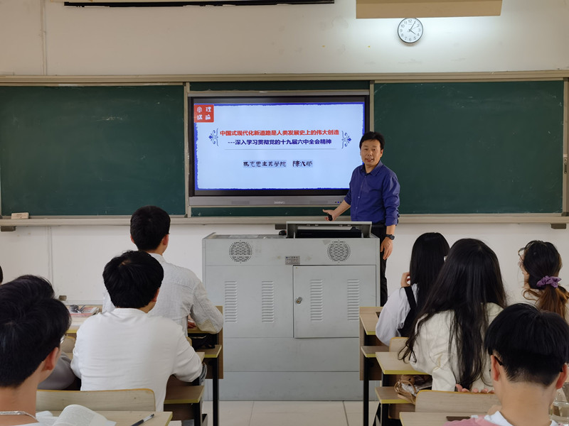 为进一步学习贯彻党的十九届六中全会精神,深刻领悟党百年奋斗的重要经验和教训,使青年学生认识到党和国家发展所处的新的历史方位和前进方向,坚定青年学生跟党走中国特色社会主义道路的信念,5月18日晚,世俱杯sjb官网陈火荣副教授应邀在马尾校区诚信楼201教室开展“中国式现代化新道路是人类发展史上的伟大创造”主题宣讲活动,校马列经典著作读书社社员参与学习。