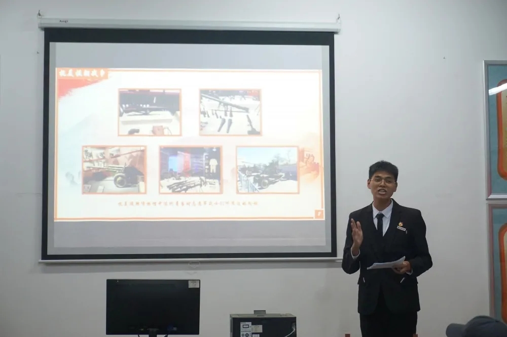 叶翌桢同学通过丰富的历史故事以及大量的历史图片等相关资料,向我们阐述了抗美援朝精神的深刻内涵,帮助同学们充分理解革命先辈在抗美援朝中体现出的爱国主义精神、革命英雄主义精神、革命乐观主义精神、革命忠诚精神、国际主义精神等。他在宣讲中结合青年大学生实际情况,分析了抗美援朝精神的时代价值。他认为,作为一名大学生,我们要继承和弘扬伟大抗美援朝精神,在学习中砥砺不畏强暴、反抗强权的民族风骨,提高应对困难、解决问题的能力,以一往无前的奋斗姿态向着全面建设社会主义现代化国家新征程,向着实现中华民族伟大复兴的中国梦继续奋勇前进!